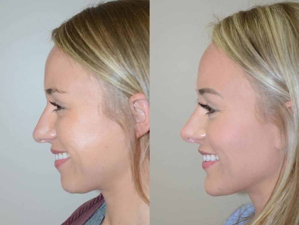 In cases of fleshy noses, cartilage reinforcement is necessary to maintain shape and prevent tip drooping or reversion. Nasal deviations or fractures are also more common in men due to trauma or intense sports. These issues can be corrected alongside cosmetic reshaping. The before-and-after images provided show a case of a “crooked nose,” where the nasal bridge and septum were deviated, and the tip was rotated off-center.